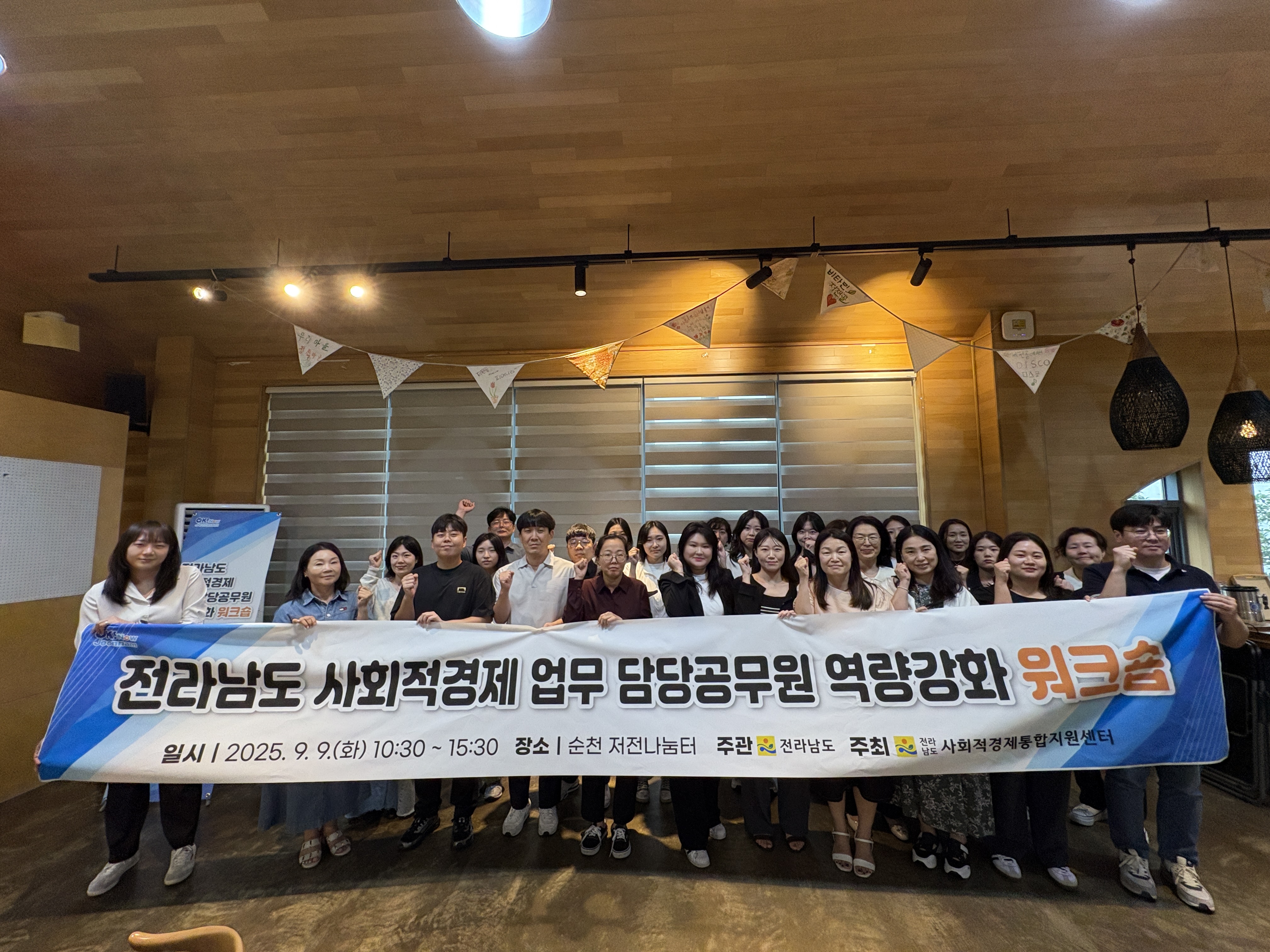 전남 사회적경제 업무 담당공무원 역량 강화 워크숍일시 : 2025. 9. 9.(화) 10:30~16:00장소 : 순천 저전나눔터(순천시 은하길67)전라남도 사회적경제 업무 담당 공무원 대상 역량강화 워크숍을 개최했습니다.이번 워크숍은 새정부 사회연대경제 정책 방향을 이해하고,현장에서 이루어지는 인증ㆍ지정ㆍ설립ㆍ지원제도 실무를 점검 할 수 있는 시간이었습니다.우수기업 사례로 (주)문화예술공동체사라실(대표 조주현)과농업회사법인 서당골(주)(사무장 이호성)이 현장 경험과 성장 전략을 발표했습니다.앞으로도 정책-현장 연결을 강화하며,사회적경제기업의 성장 발판 확대를 위해 더더욱 노력하겠습니다.