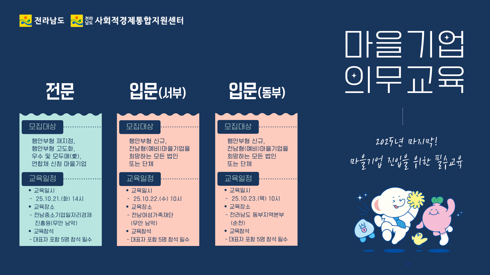 전라남도 사회적경제조직 소셜 프랜차이즈 협약식일시 : 2025. 08. 22.(금) 10시 ~ 17시장소 : 전라남도교육청 순천만생태문화교육원참석자 : 소셜 프랜차이즈 선정기업 5개소 전라남도와 전남사회적경제통합지원센터에서는도내 사회적경젝업의 프랜차이즈 가능성 진단과 성공모델 구축을 위해'전라남도 사회적경제조직의 프랜차이즈화 지원사업'을 추진하고 있습니다.이번 협약식 및 교육은 선정기업이 소셜 프랜차이즈 개념을 정립하고,가맹사업에 대한 구조와 법률을 이해할 수 있도록 구성되었으며지원사업 참여에 따른 권리와 의무사항을 확정하고 상호 신뢰 기반 구축을 위해 개최되었습니다.추후 진행되는 컨설팅 등을 통해우리 기업들이 소셜 프랜차이즈 사업 추진 관련 실무능력이 향상되길 기대해봅니다.