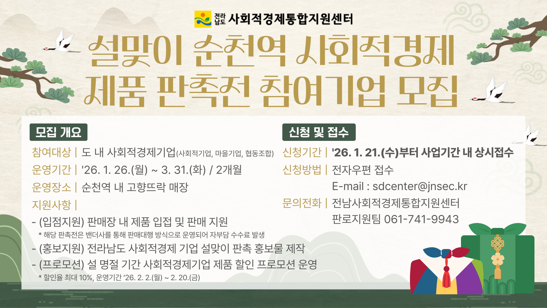 2025년 3차 전라남도 마을기업 의무(입문,전문)교육일시 : 2025. 10. 21.(화)~23. (목)대상 : (입문) 마을기업 신규 진입 희망 단체 (전문) 2026 행안부형 재지정 이상 진입 희망기업교육은 지식재산권 관리, 우수 마을기업 사례, 효과적인 홍보 마케팅 방법, 보조금 집행 시 유의사항 등으로 구성하였습니다.의무교육을 통해 마을기업의 업무 능력 향상을 도모하고, 기업의 질적 성장 및 원활한 후속단계 진입을 기대합니다.