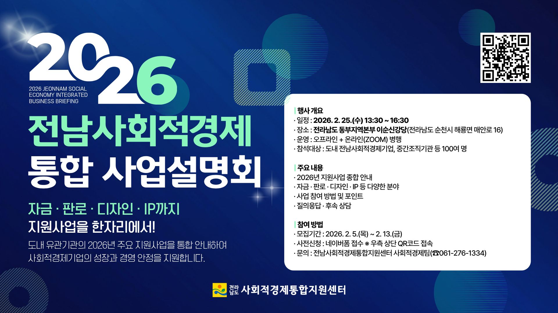 2025년 전라남도 사회적경제 통합 워크숍일시 : 12. 10. ~ 11.장소 : 목포 폰타나호텔주최주관 : 전라남도ㆍ전남사회적경제통합지원센터전라남도 사회적경제기업인들을 위한 "2025년 전라남도 사회적경제 통합 워크숍"이 개최되었습니다.사회적경제인, 시도 담당자, 중간지원조직 등 100여명이 참여한 이번 워크숍은일자리경제과장님을 모시고 애로사항을 나눌 수 있는 간담회,2025년 우리 센터 사업성과 공유, 우수 사례 발표 등 알찬 구성으로 준비되었습니다.워크숍에 적극적으로 참여해주신 사회적경제인 여러분과 유관기관 및 중간지원조직분들께 감사드립니다.이번 자리가 모두에게 힘이 되고, 자원이 되는 시간이었길 바래봅니다.
