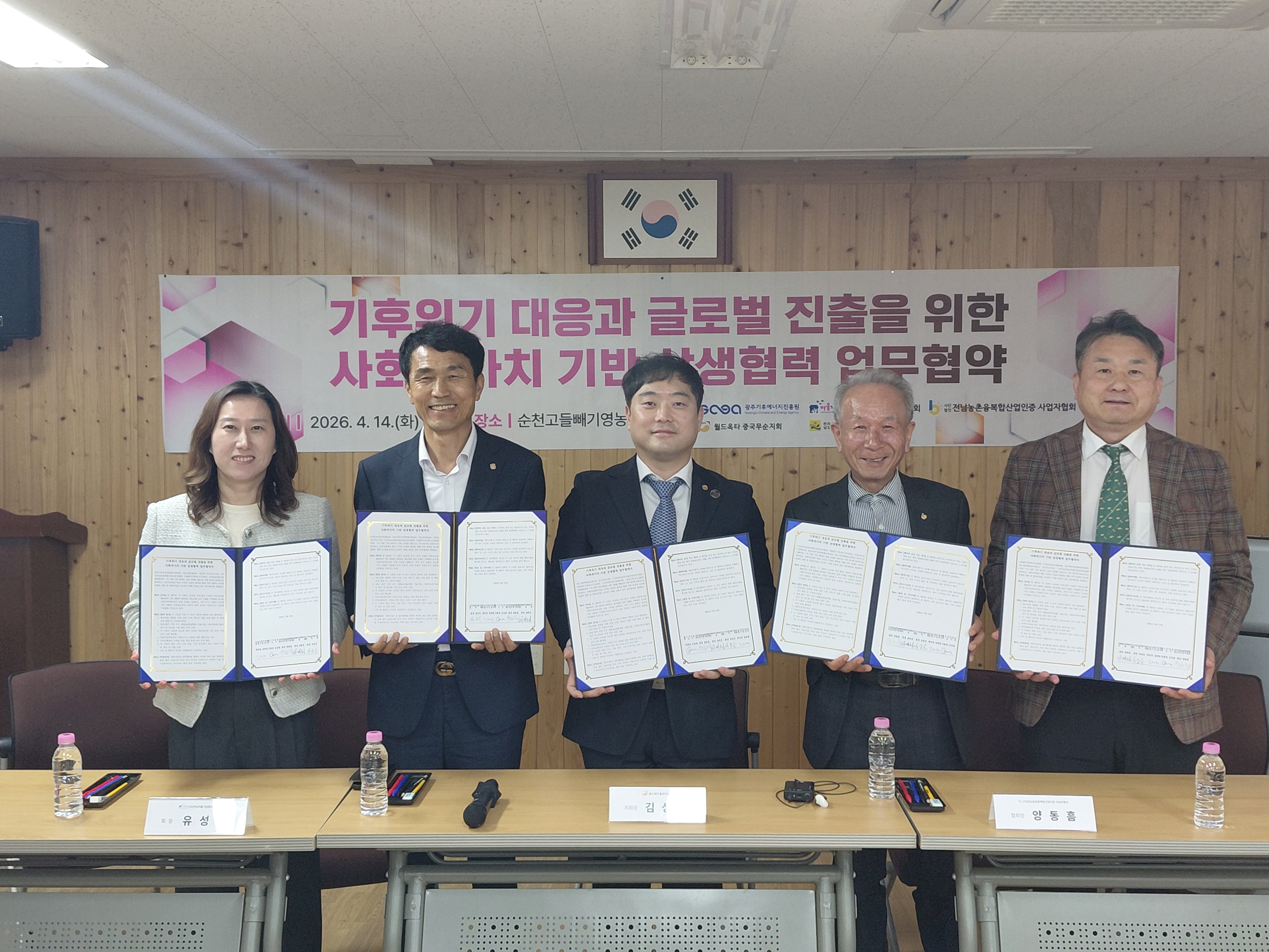 일시 : 2026. 04. 14.(화)장소 : 순천고들빼기 영농조합법인협약대상 : 월드옥타 중국무순지회, 전남농촌융복합산업인증자협회, 광주기후에너지진흥원, 전남마을기업협의회, 전남사회적경제통합지원센터전남사회적경제통합지원센터는 기후위기 대응과 지역 사회적경제 기업의 해외 진출 기반 마련을 위해 5개 기관과 업무협약을 체결하였습니다.이번 협약을 통해 각 기관은 탄소중립 실현과 사회적 가치 확산을 위한 협력체계를 구축하고, 기후위기 대응을 위한 공동 실천을 추진하기로 하였습니다.