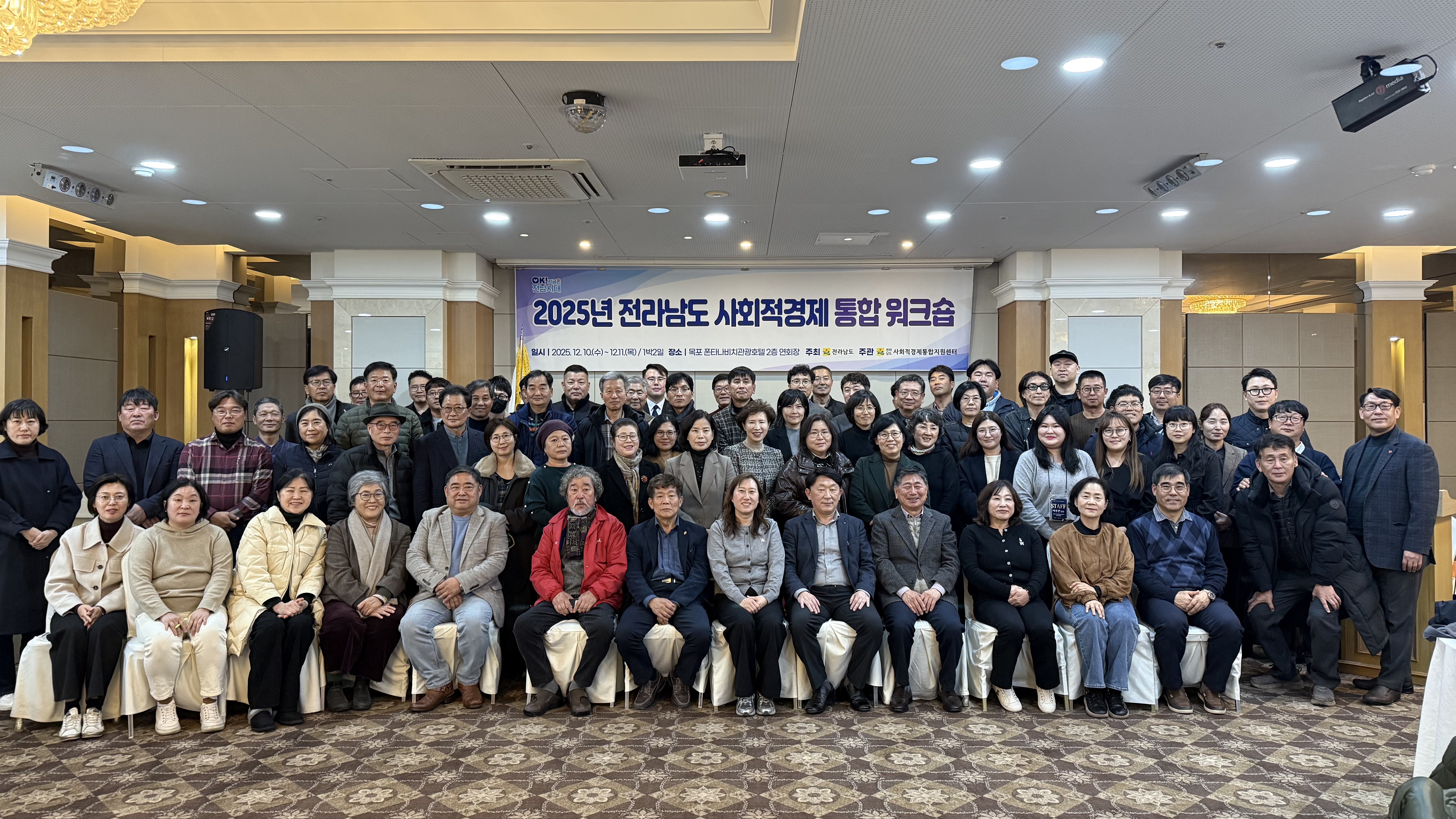 2025년 전라남도 사회적경제 통합 워크숍일시 : 12. 10. ~ 11.장소 : 목포 폰타나호텔주최주관 : 전라남도ㆍ전남사회적경제통합지원센터전라남도 사회적경제기업인들을 위한 "2025년 전라남도 사회적경제 통합 워크숍"이 개최되었습니다.사회적경제인, 시도 담당자, 중간지원조직 등 100여명이 참여한 이번 워크숍은일자리경제과장님을 모시고 애로사항을 나눌 수 있는 간담회,2025년 우리 센터 사업성과 공유, 우수 사례 발표 등 알찬 구성으로 준비되었습니다.워크숍에 적극적으로 참여해주신 사회적경제인 여러분과 유관기관 및 중간지원조직분들께 감사드립니다.이번 자리가 모두에게 힘이 되고, 자원이 되는 시간이었길 바래봅니다.