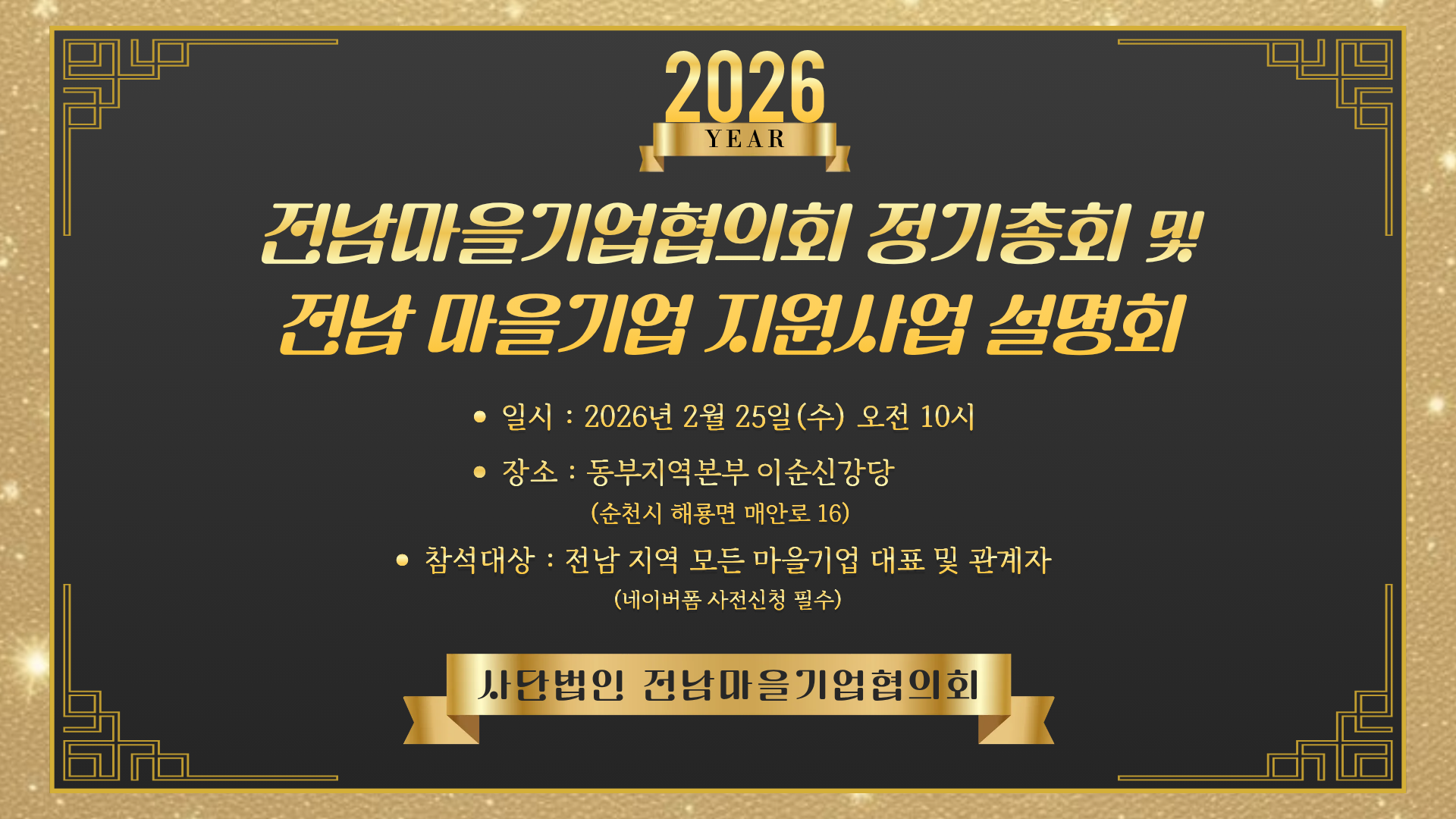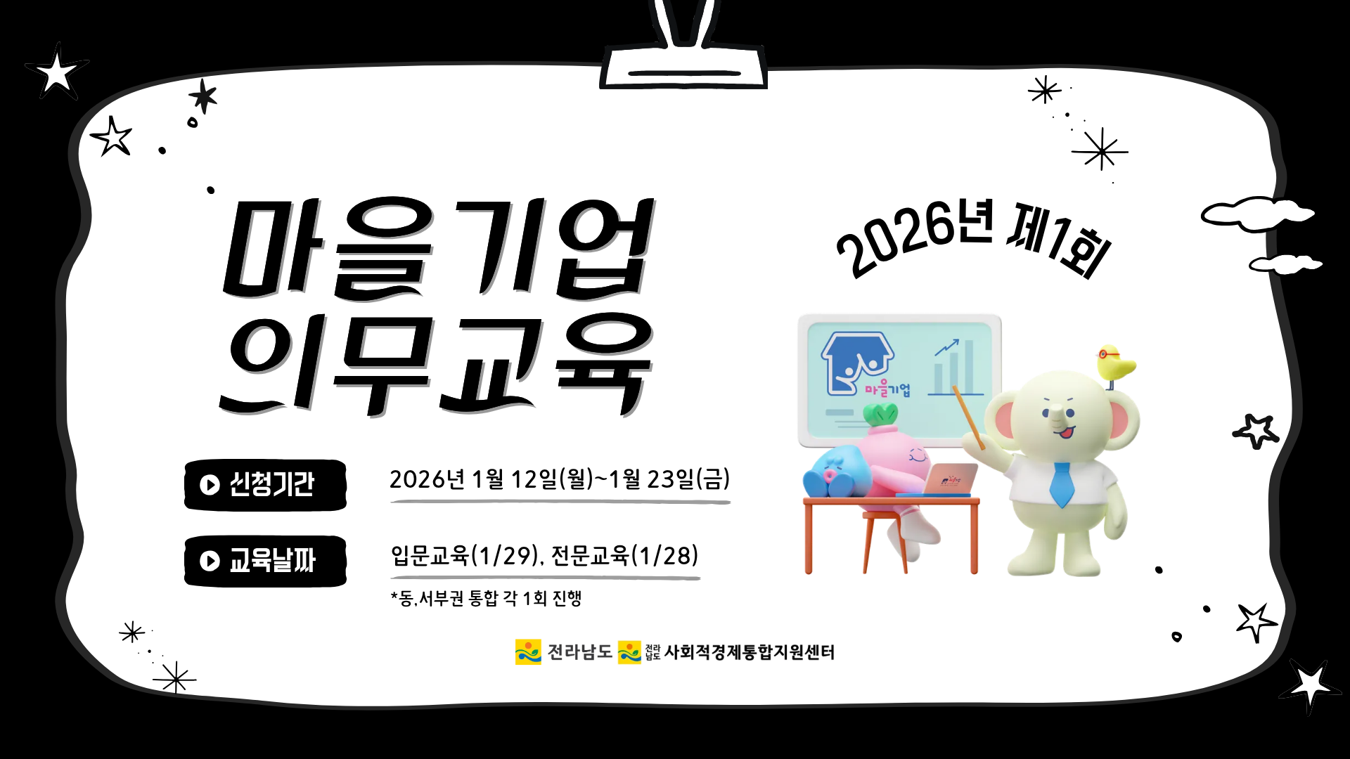 2025년 3차 전라남도 마을기업 의무(입문,전문)교육일시 : 2025. 10. 21.(화)~23. (목)대상 : (입문) 마을기업 신규 진입 희망 단체 (전문) 2026 행안부형 재지정 이상 진입 희망기업교육은 지식재산권 관리, 우수 마을기업 사례, 효과적인 홍보 마케팅 방법, 보조금 집행 시 유의사항 등으로 구성하였습니다.의무교육을 통해 마을기업의 업무 능력 향상을 도모하고, 기업의 질적 성장 및 원활한 후속단계 진입을 기대합니다.