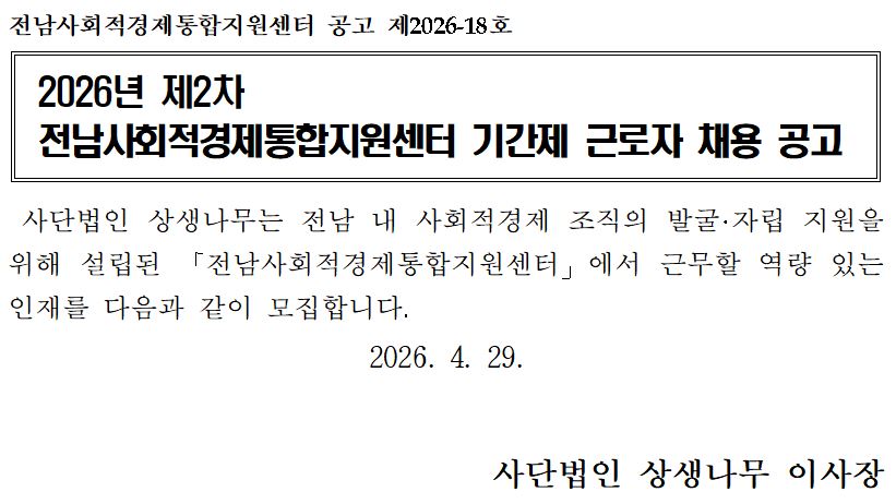 2026년 재정지원 시군 담당자 사업설명회일시 : 2026. 2. 6. 14:00 ~ 16:00장소 : 전남도청 동부지역본부 1층 이순신강당전라남도 사회적경제 시군 담당자 대상 재정지원 사업설명회를 진행했습니다.2026년 사회적경제 사업을 안내하고,상반기 재정지원사업 추진계획과 관련하여 의견수렴하는 자리를 가졌습니다.기업 지원을 위해 사전에 준비된 설명회인 만큼기존에 진행되었던 사업과 더불어 새롭게 추진되는 사업,전년대비 변경사항 등을 나눌 수 있었습니다.재정지원공모는 2월부터 진행되오니자세한 사항은 도청 누리집을 참고 부탁드립니다.